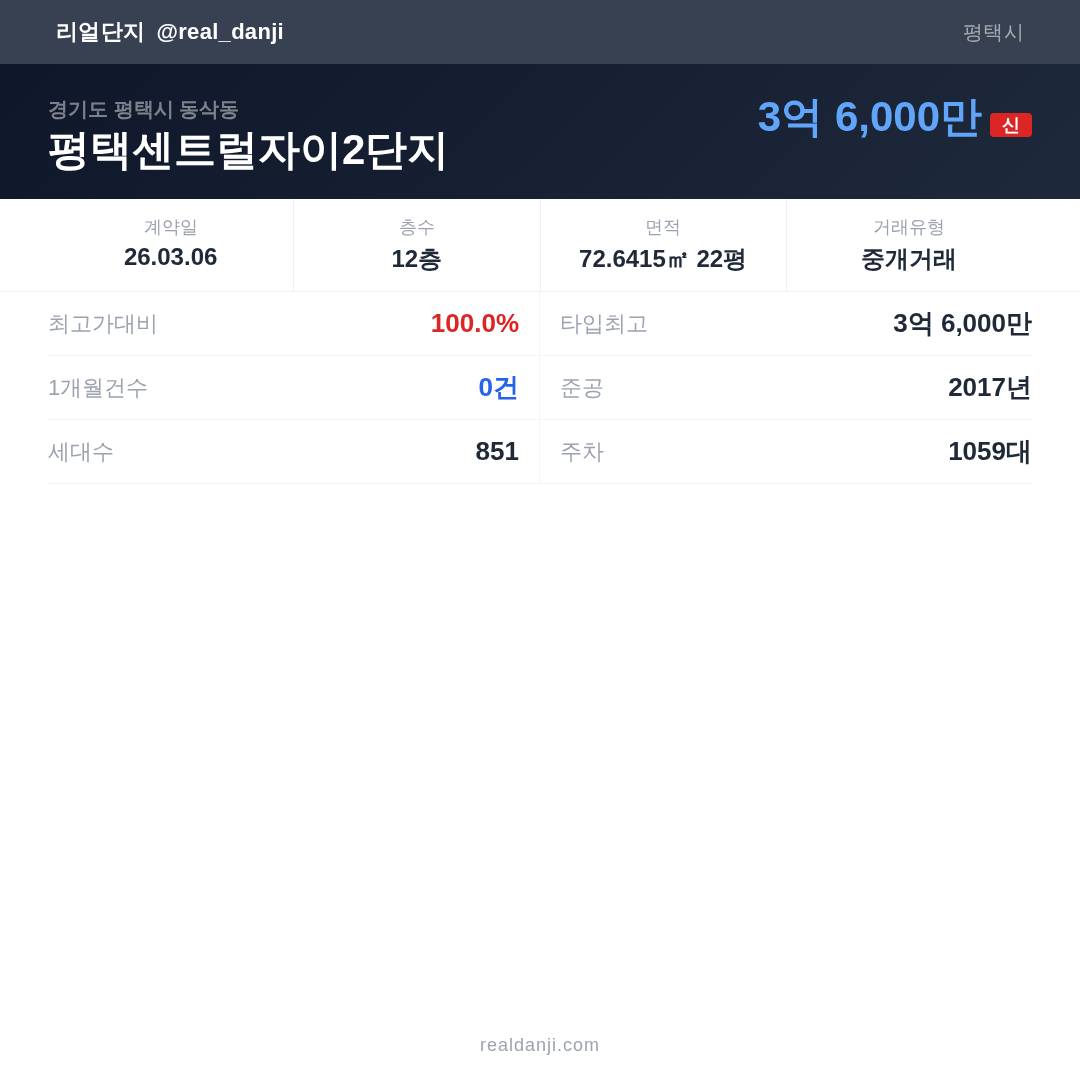 평택센트럴자이2단지 최근 거래가는 3억 6,000만입니다. (2026-03)