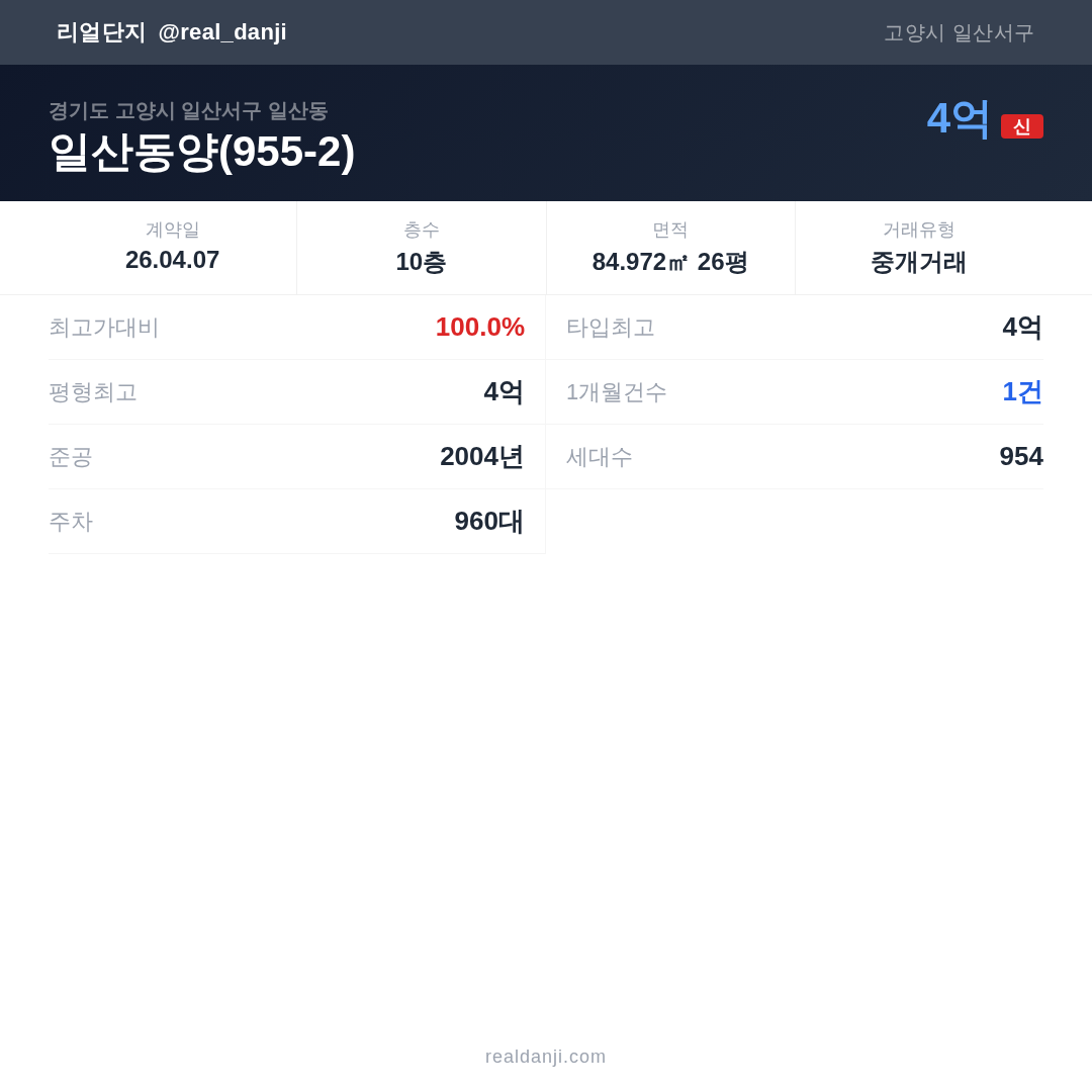 일산동양(955-2) 최근 거래가는 4억입니다. (2026-04)