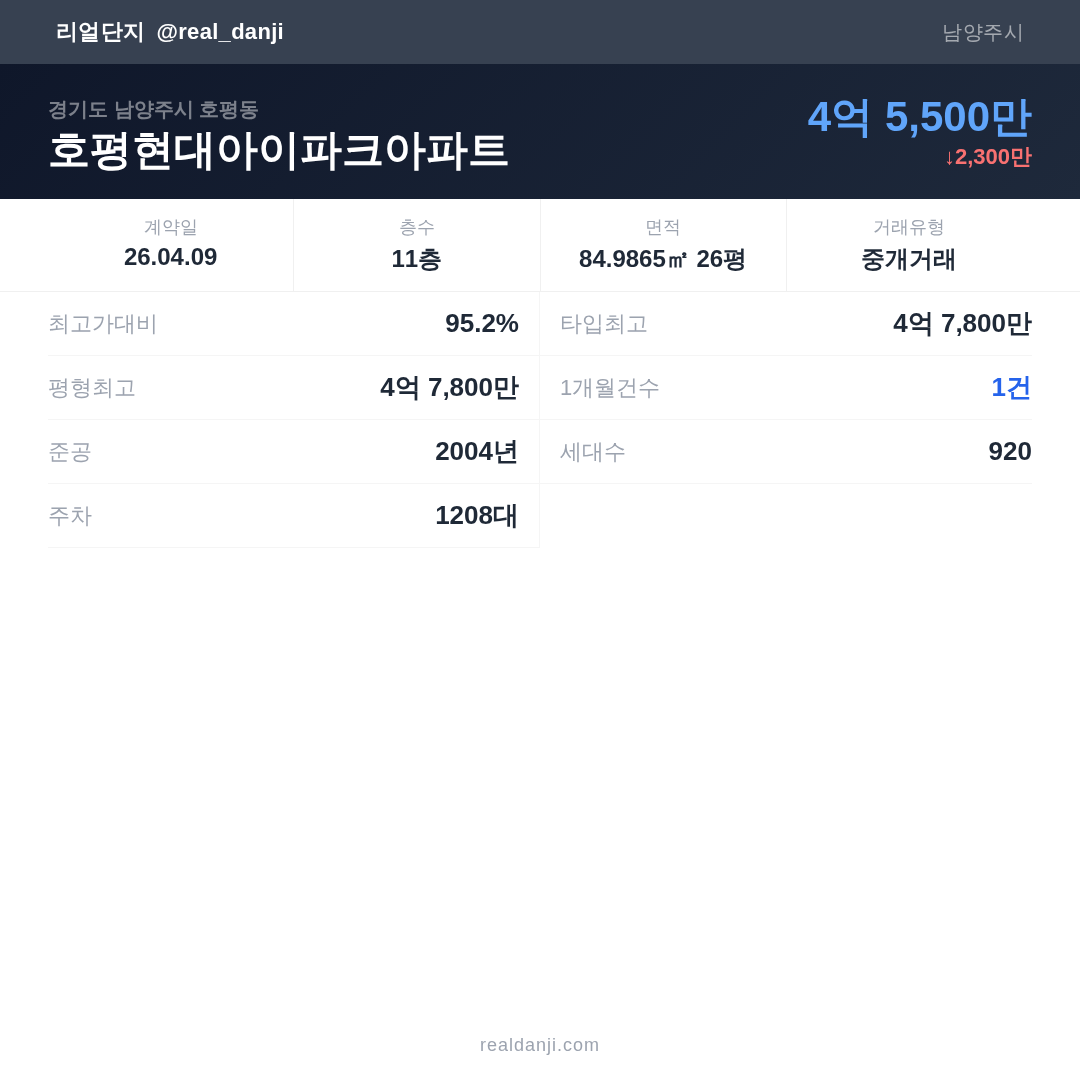 호평현대아이파크아파트 최근 거래가는 4억 7,800만입니다. (2026-04)