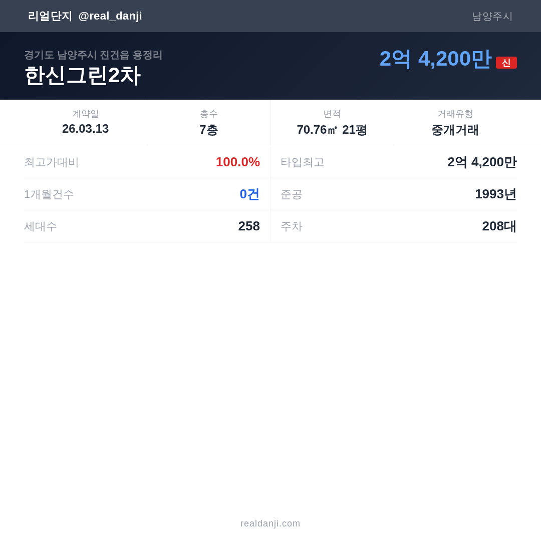 한신그린2차 최근 거래가는 2억 4,200만입니다. (2026-03)