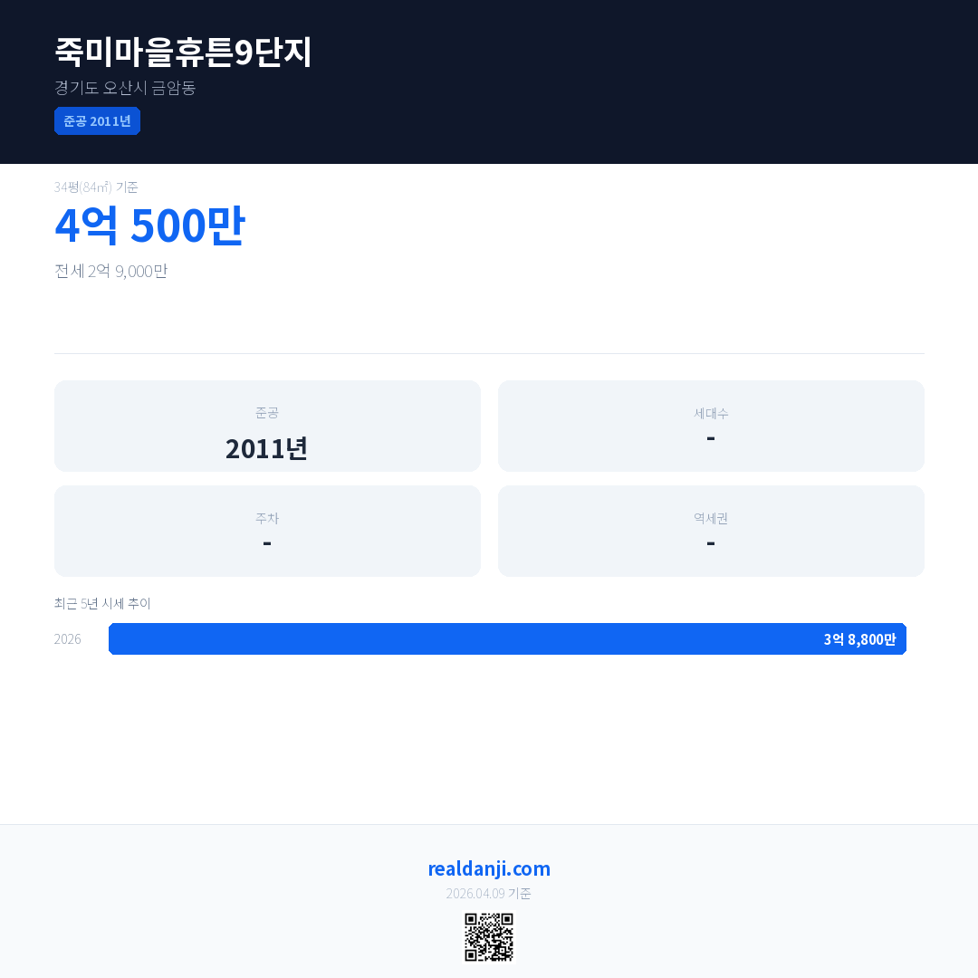 죽미마을휴튼9단지 최근 거래가는 4억 500만입니다. (2026-03)