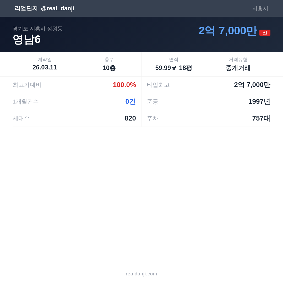 영남6 최근 거래가는 2억 7,000만입니다. (2026-03)