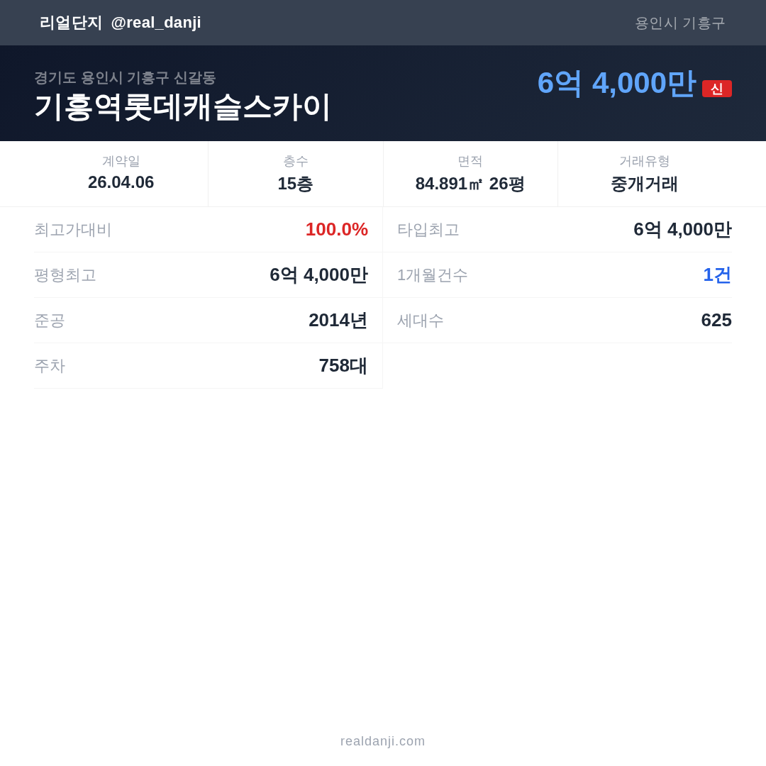 기흥역롯데캐슬스카이 최근 거래가는 6억 4,000만입니다. (2026-03)