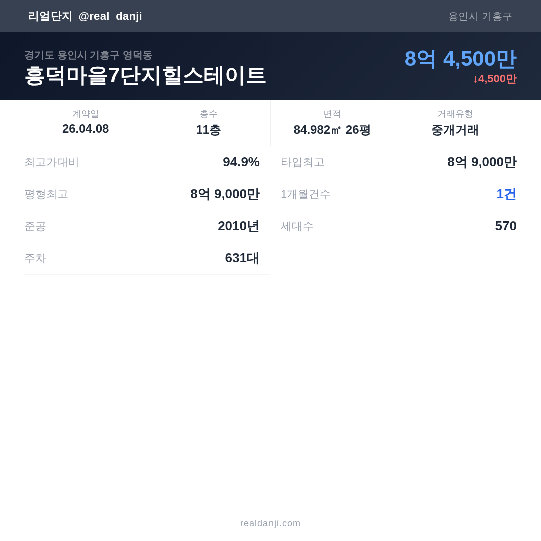흥덕마을7단지힐스테이트 최근 거래가는 8억 9,000만입니다. (2026-04)