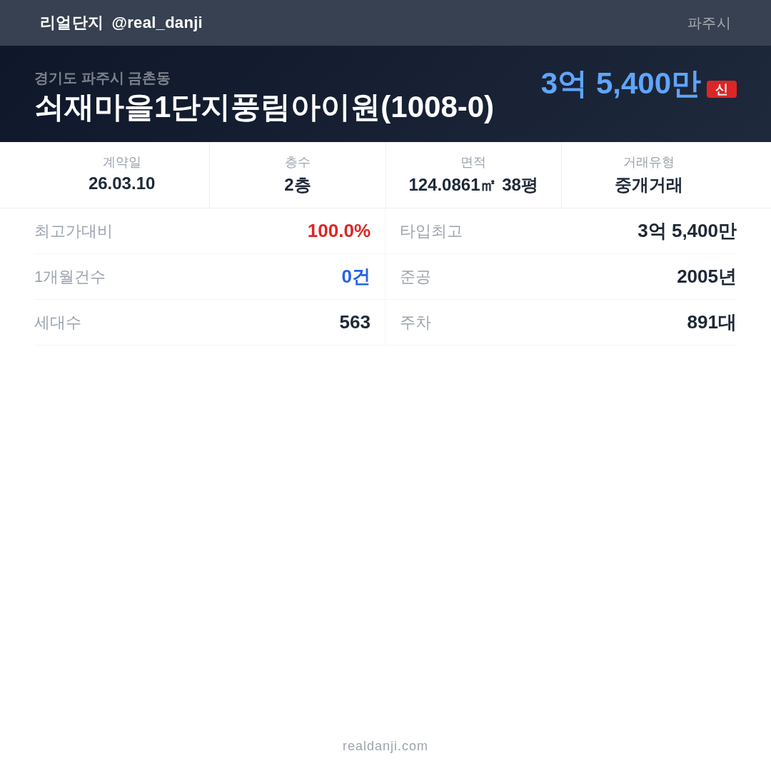 쇠재마을1단지풍림아이원(1008-0) 최근 거래가는 3억 5,400만입니다. (2026-03)