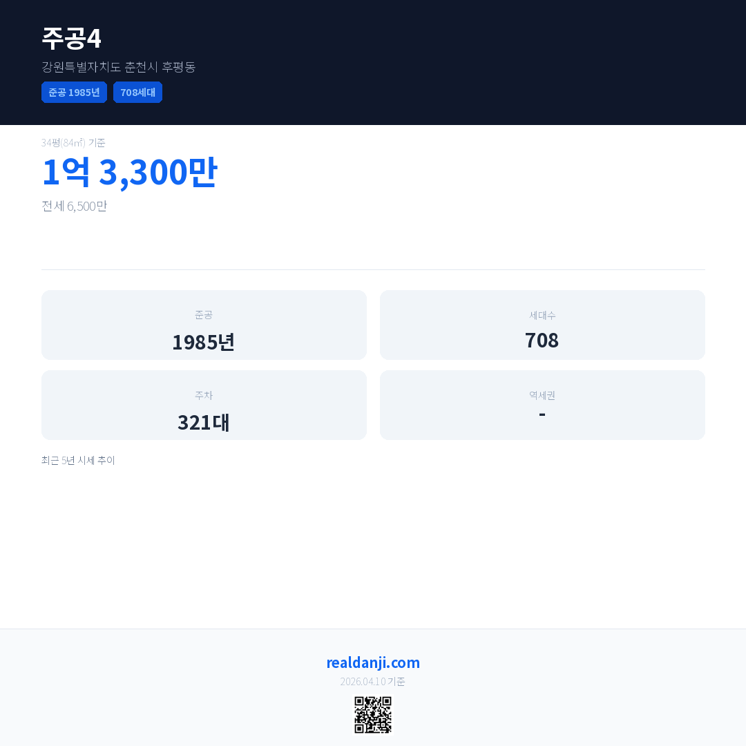 주공4은(는) 1985년에 준공되었으며, 현재 41년차입니다. 총 708세대 규모입니다.