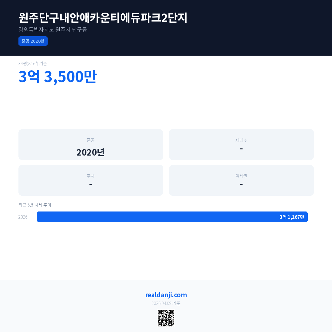 원주단구내안애카운티에듀파크2단지 최근 거래가는 3억 3,500만입니다. (2026-03)