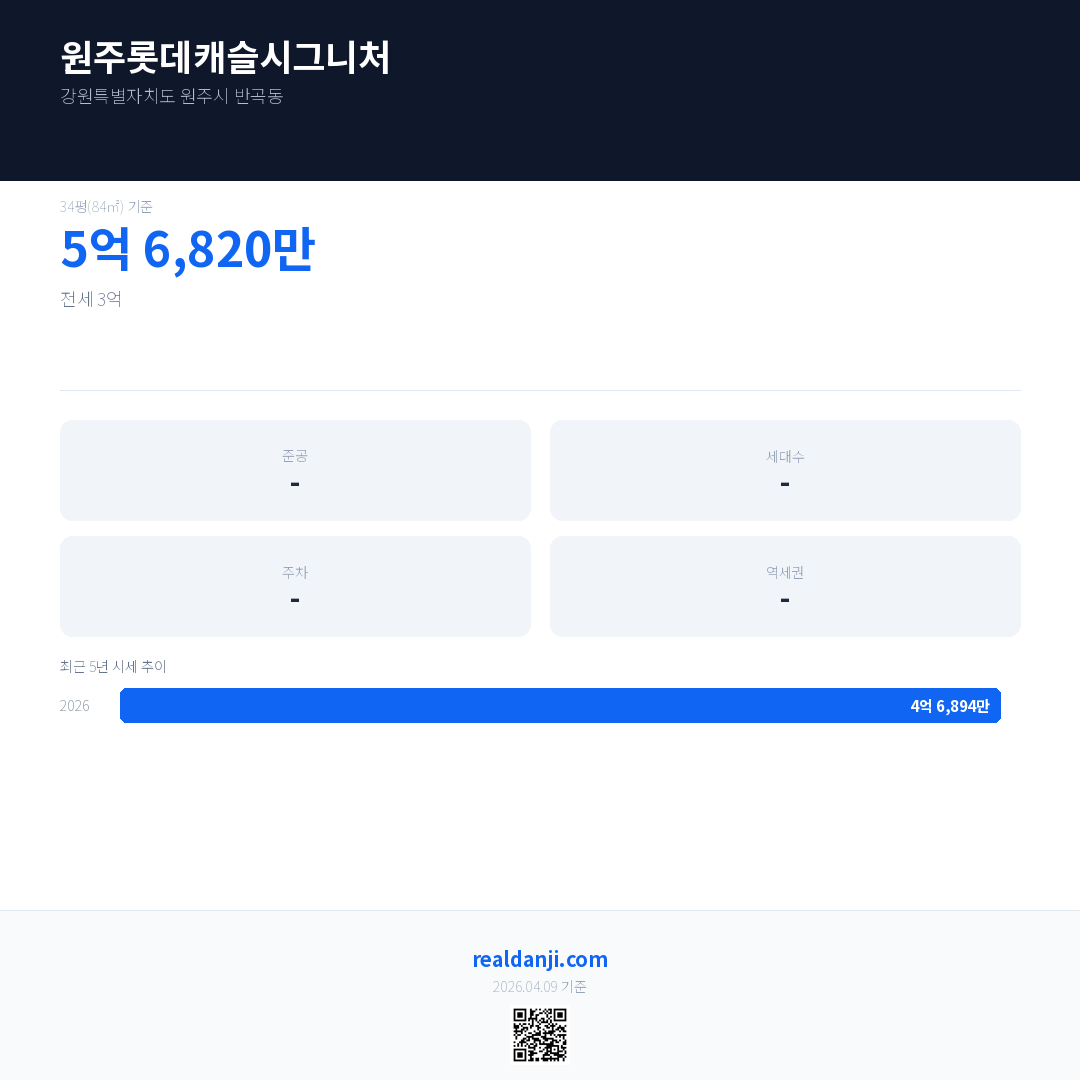 원주롯데캐슬시그니처 최근 거래가는 5억 6,820만입니다. (2026-03)