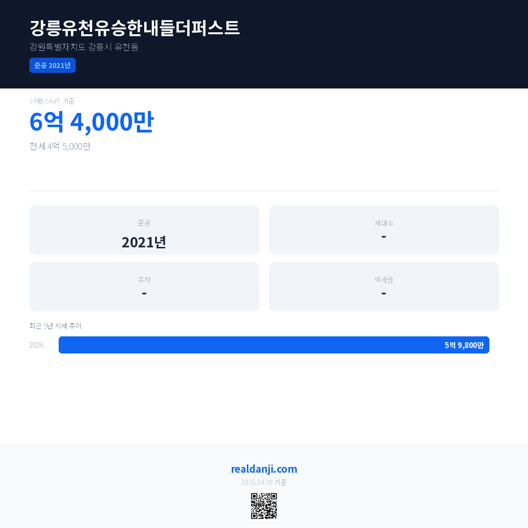 강릉유천유승한내들더퍼스트 최근 거래가는 6억 4,000만입니다. (2026-03)