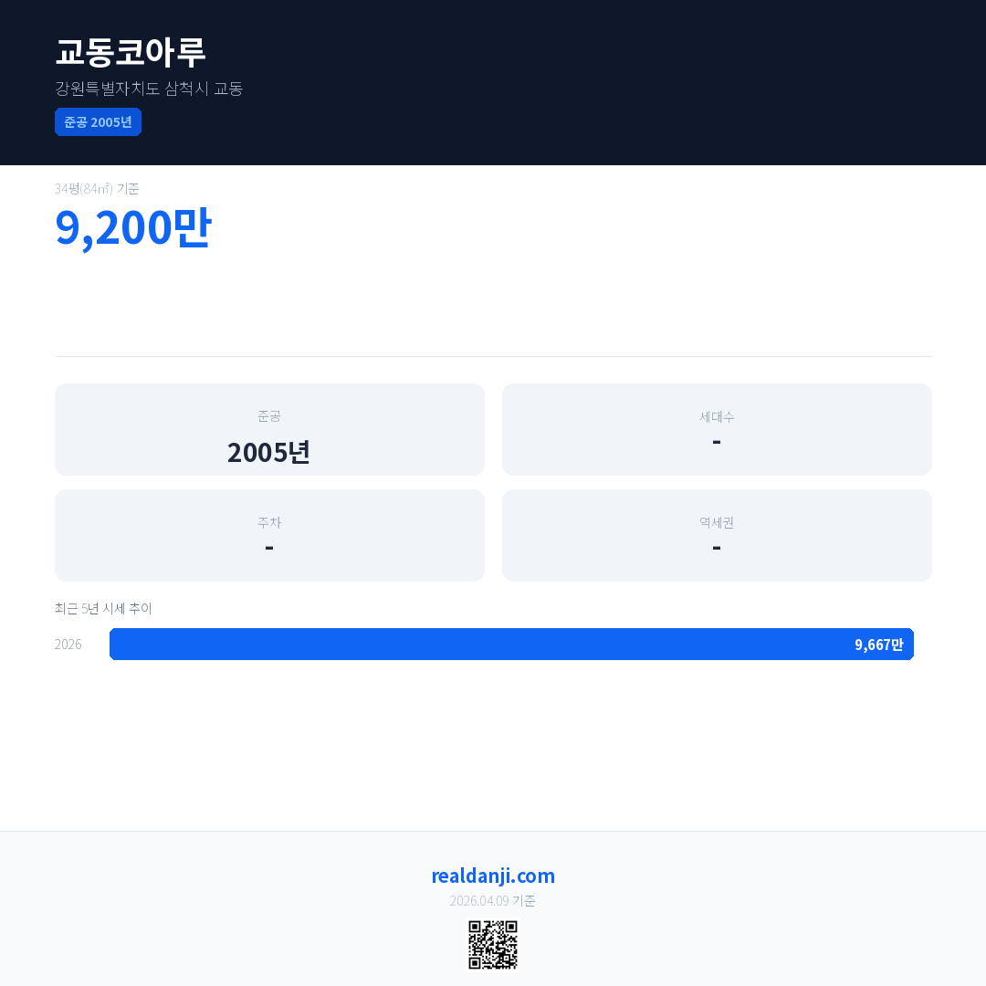 교동코아루 최근 거래가는 1억 300만입니다. (2026-03)