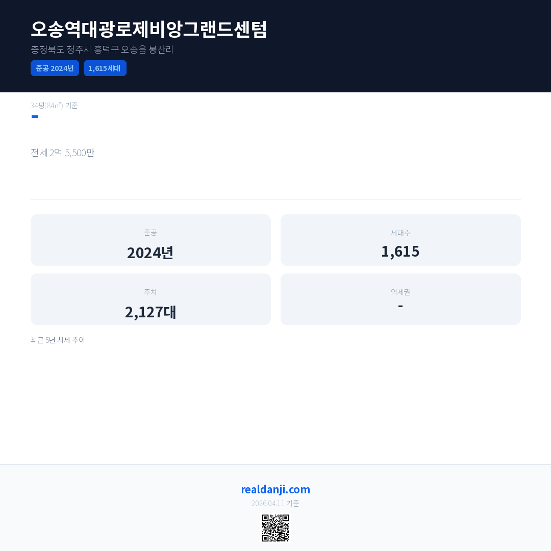오송역대광로제비앙그랜드센텀은(는) 2024년에 준공되었으며, 현재 2년차입니다. 총 1,615세대 규모입니다.