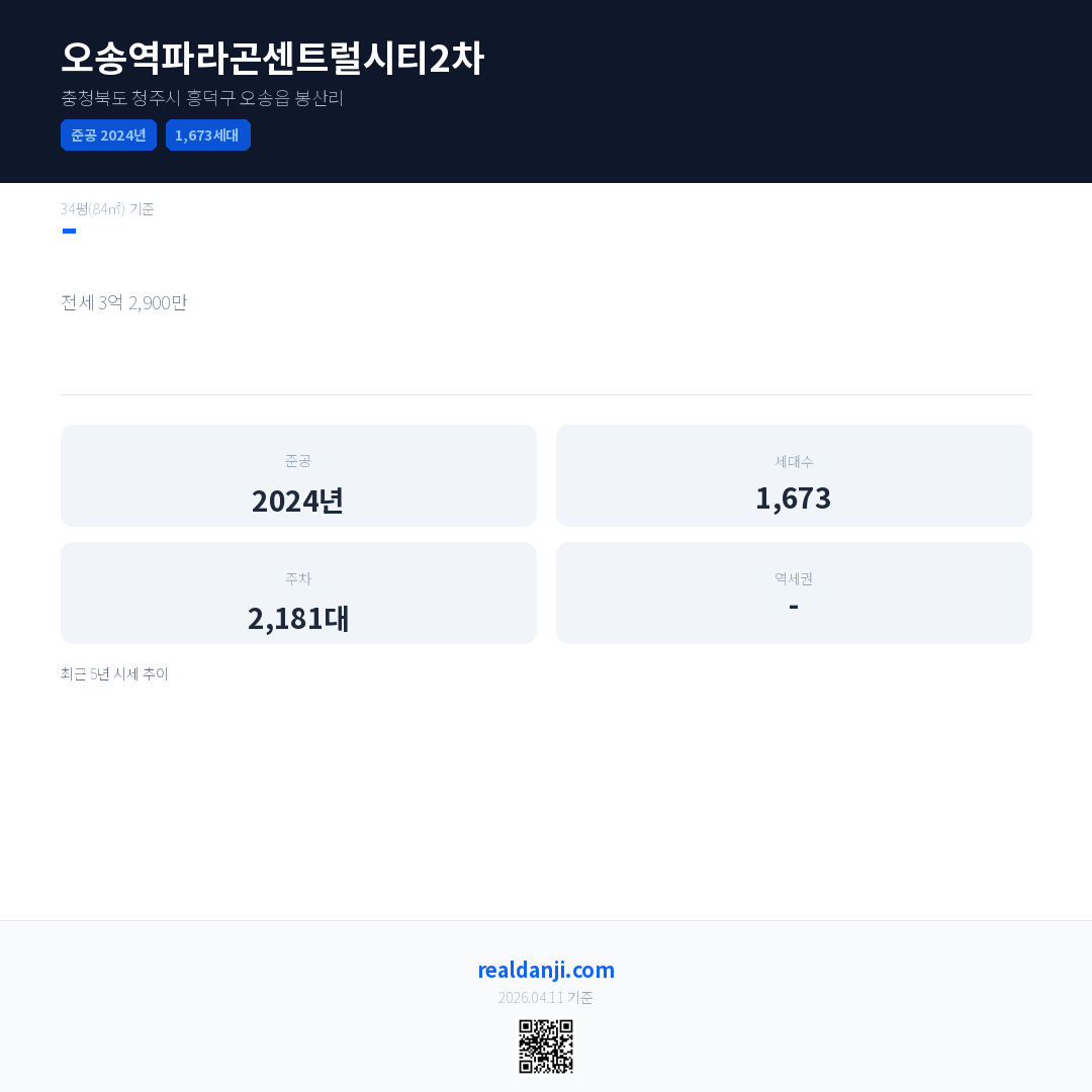 오송역파라곤센트럴시티2차은(는) 2024년에 준공되었으며, 현재 2년차입니다. 총 1,673세대 규모입니다.