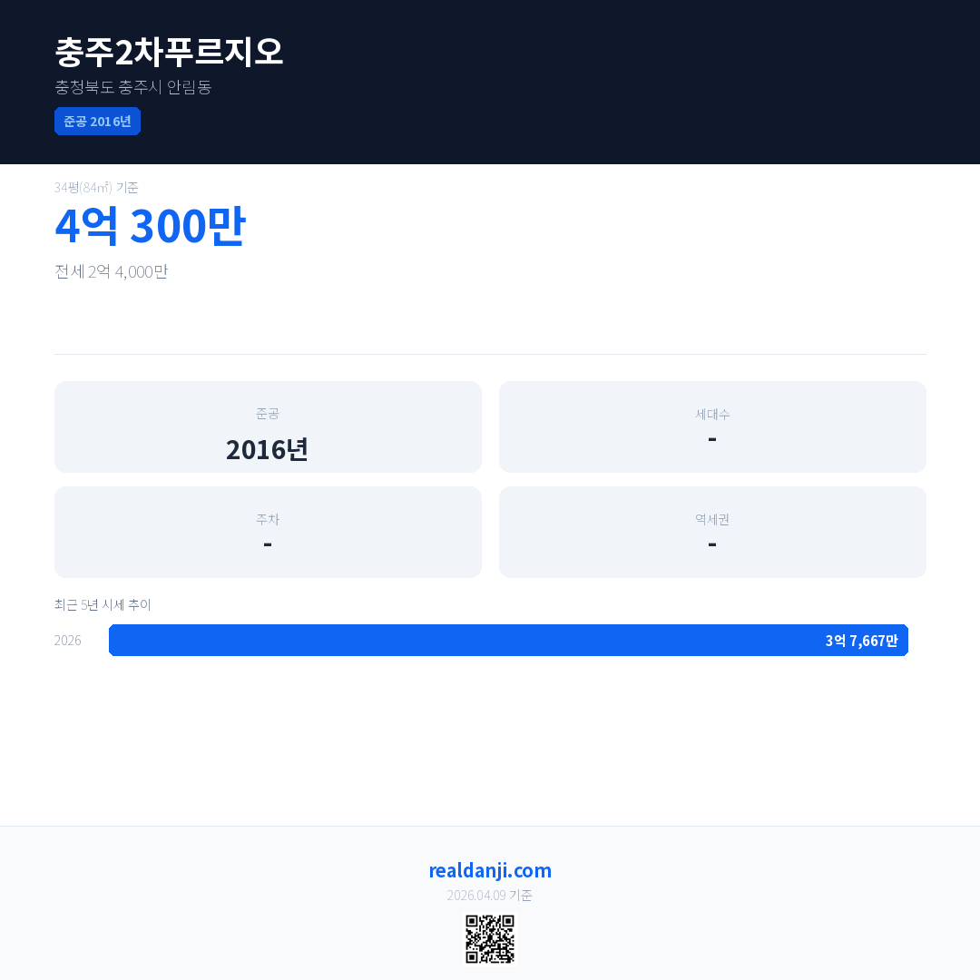 충주2차푸르지오 최근 거래가는 4억 300만입니다. (2026-03)