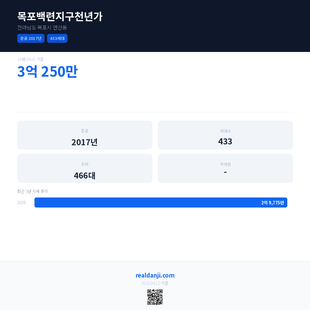 목포백련지구천년가 최근 거래가는 3억 250만입니다. (2026-03)