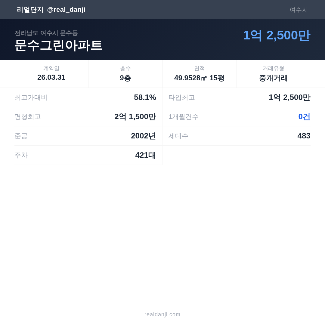 | 2026.03.31 | 50㎡ | 9층 | 1억 2,500만 |