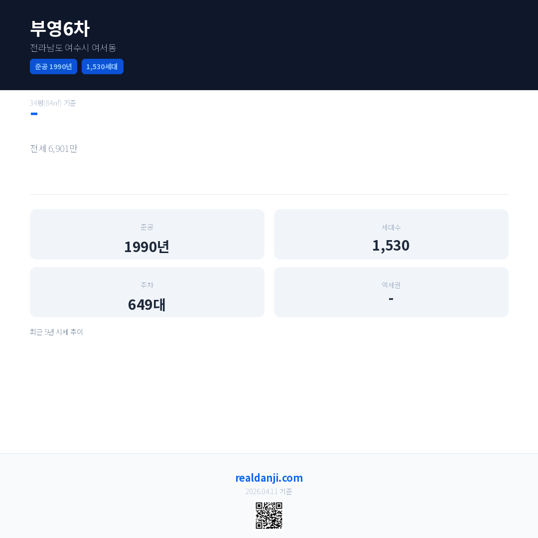 부영6차은(는) 1990년에 준공되었으며, 현재 36년차입니다. 총 1,530세대 규모입니다.