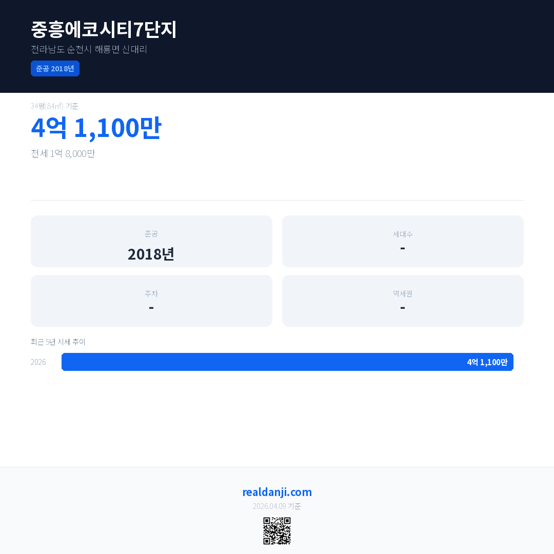 중흥에코시티7단지 최근 거래가는 4억 1,100만입니다. (2026-03)
