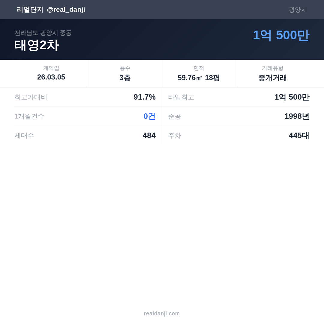 태영2차은(는) 1998년에 준공되었으며, 현재 28년차입니다. 총 484세대 규모입니다.
