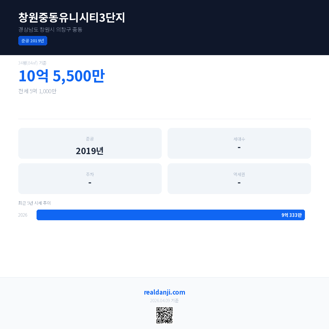 창원중동유니시티3단지 최근 거래가는 10억 5,500만입니다. (2026-03)