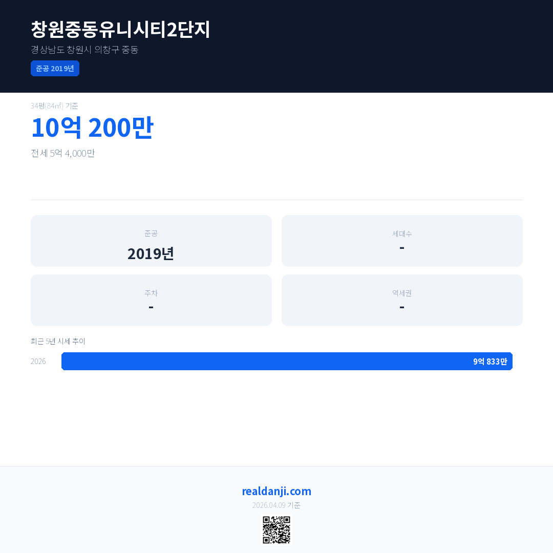 창원중동유니시티2단지 최근 거래가는 10억 200만입니다. (2026-03)