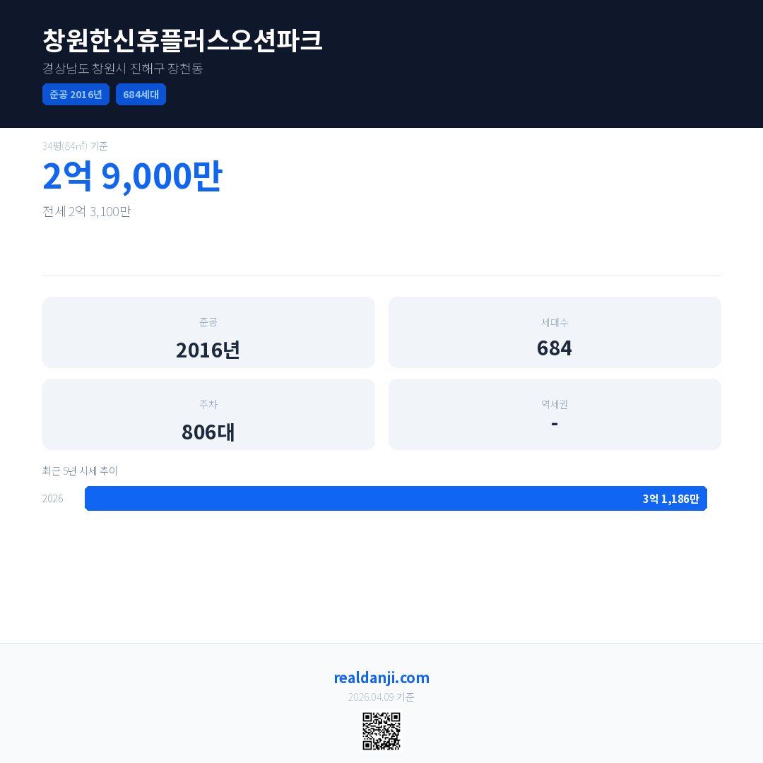 창원한신휴플러스오션파크 최근 거래가는 3억 6,400만입니다. (2026-03)