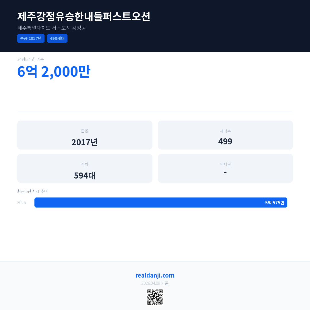 제주강정유승한내들퍼스트오션 최근 거래가는 6억 2,000만입니다. (2026-04)