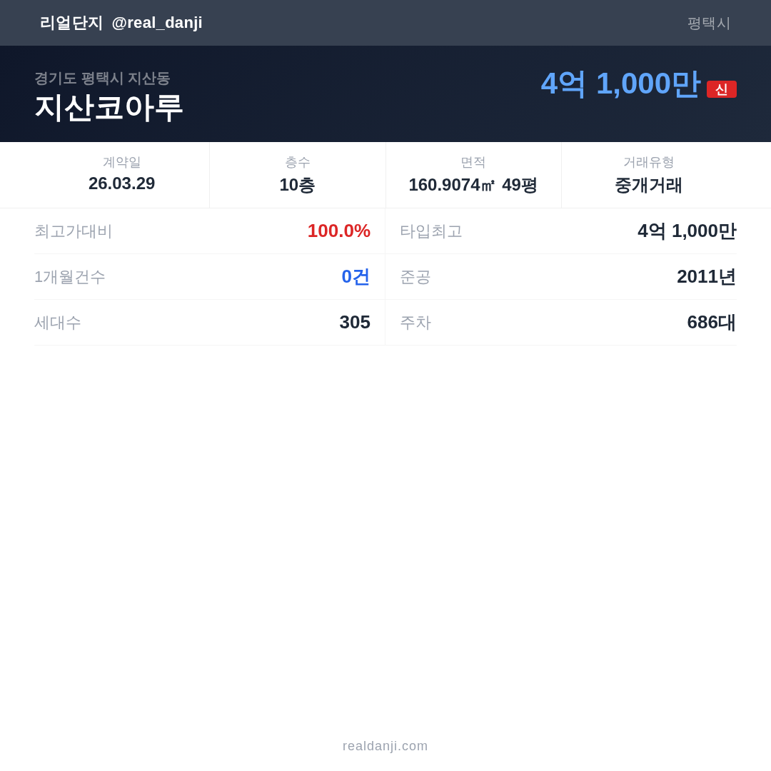 지산코아루 최근 거래가는 4억 1,000만입니다. (2026-03)