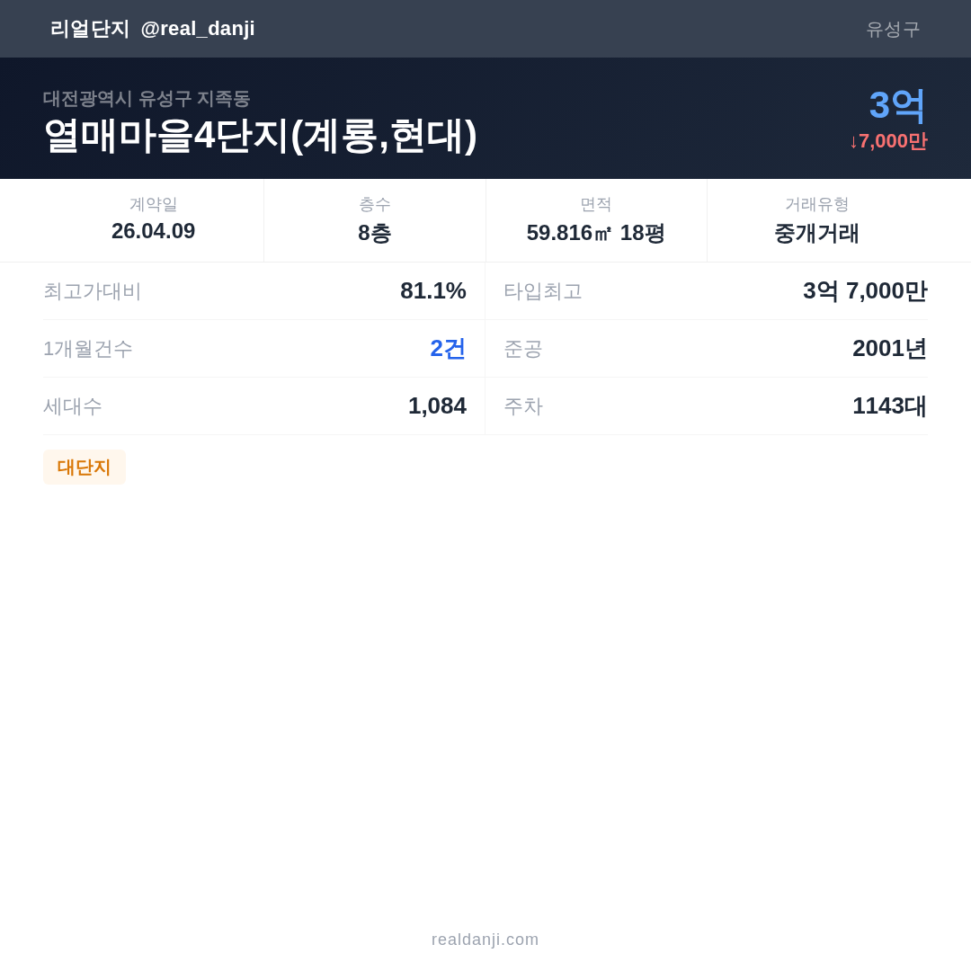 열매마을4단지(계룡,현대) 최근 거래가는 3억 7,000만입니다. (2026-04)