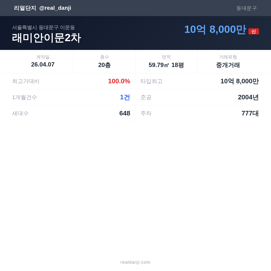 | 2026.04.07 | 60㎡ | 20층 | 10억 8,000만 |