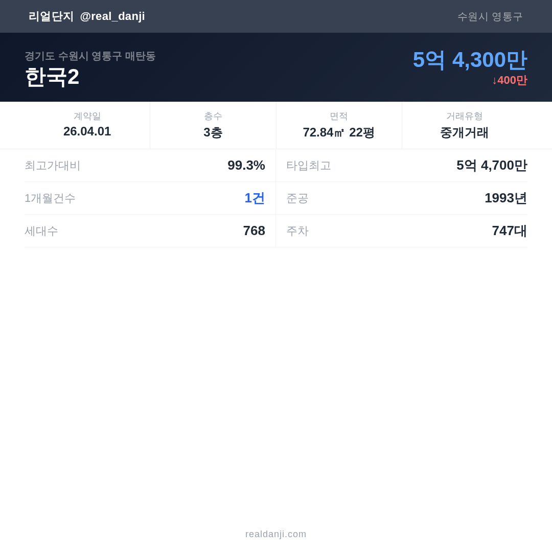 | 2026.04.01 | 73㎡ | 3층 | 5억 4,300만 |