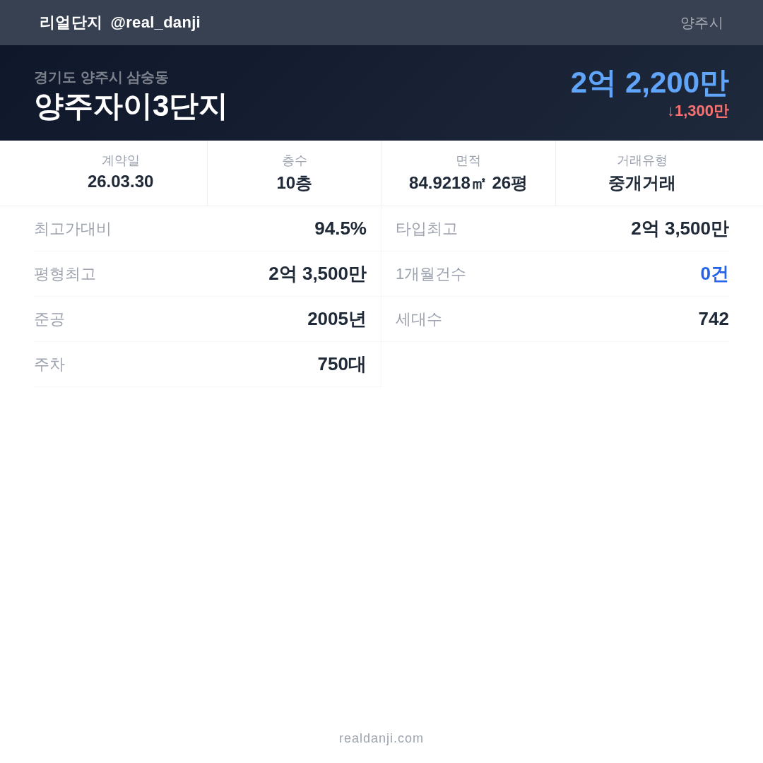양주자이3단지 최근 거래가는 2억 3,500만입니다. (2026-03)