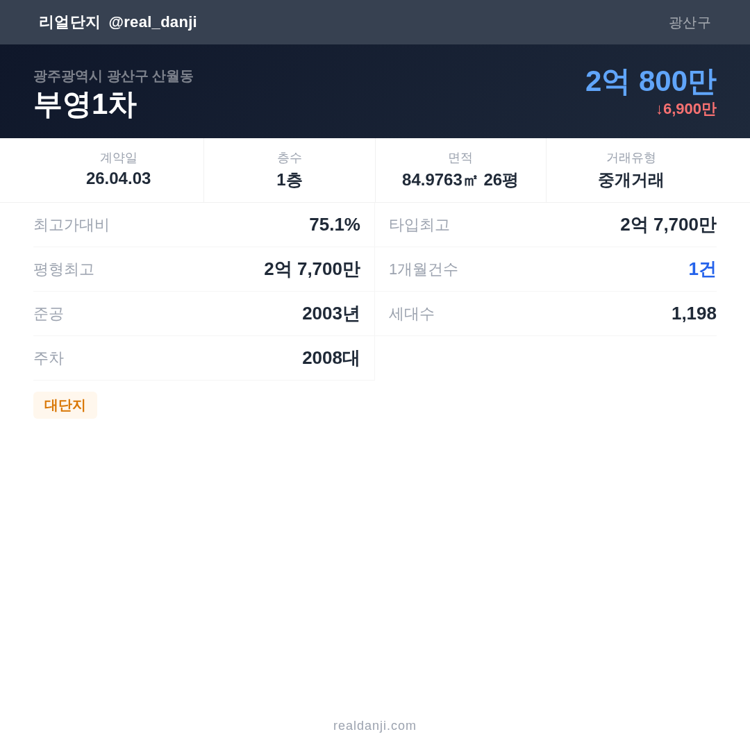 부영1차 최근 거래가는 2억 7,700만입니다. (2026-04)