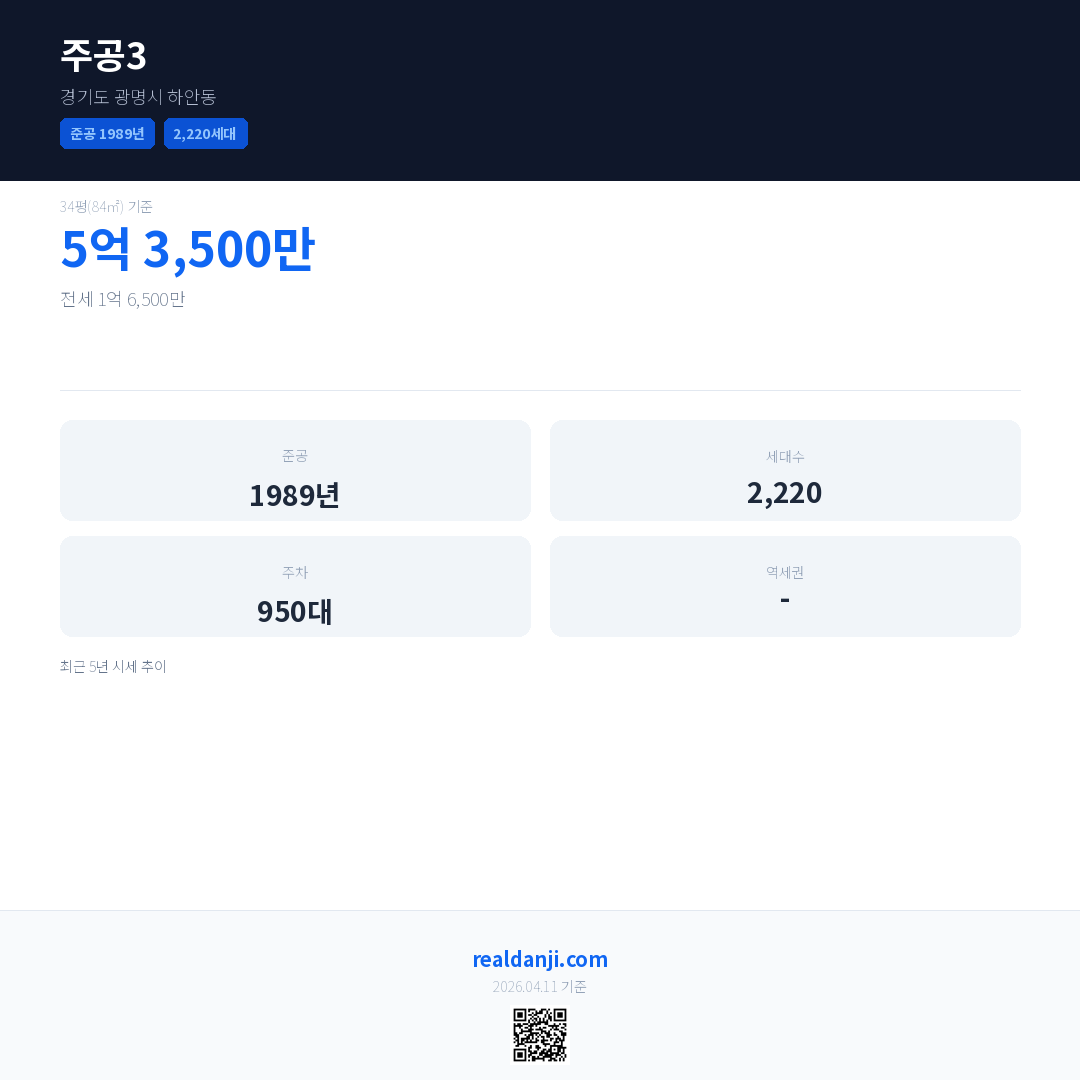 주공3은(는) 1989년에 준공되었으며, 현재 37년차입니다. 총 2,220세대 규모입니다.