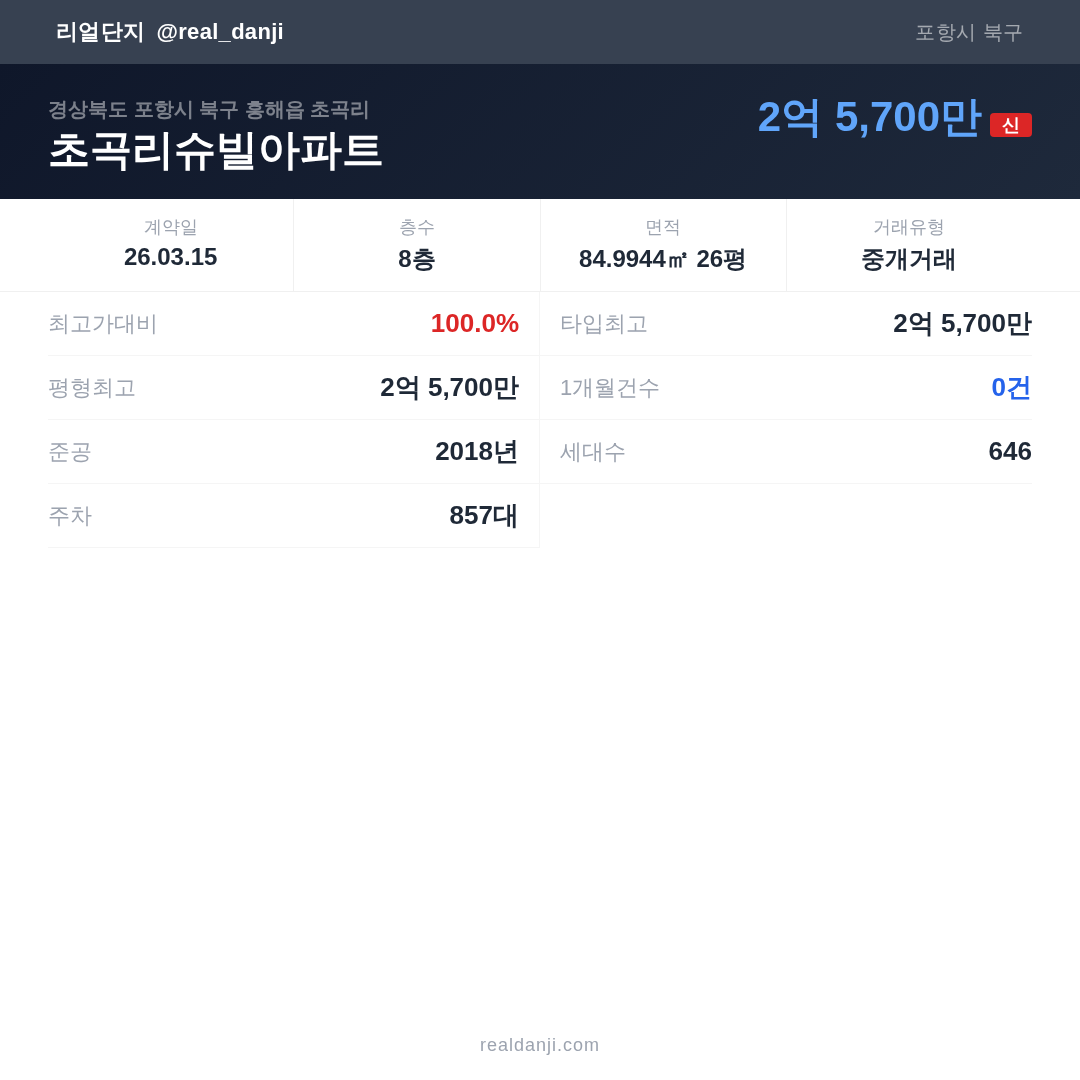 초곡리슈빌아파트 최근 거래가는 2억 5,700만입니다. (2026-03)