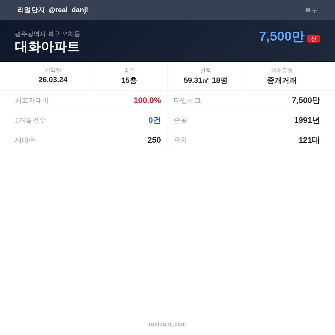 대화아파트 최근 거래가는 7,500만입니다. (2026-03)