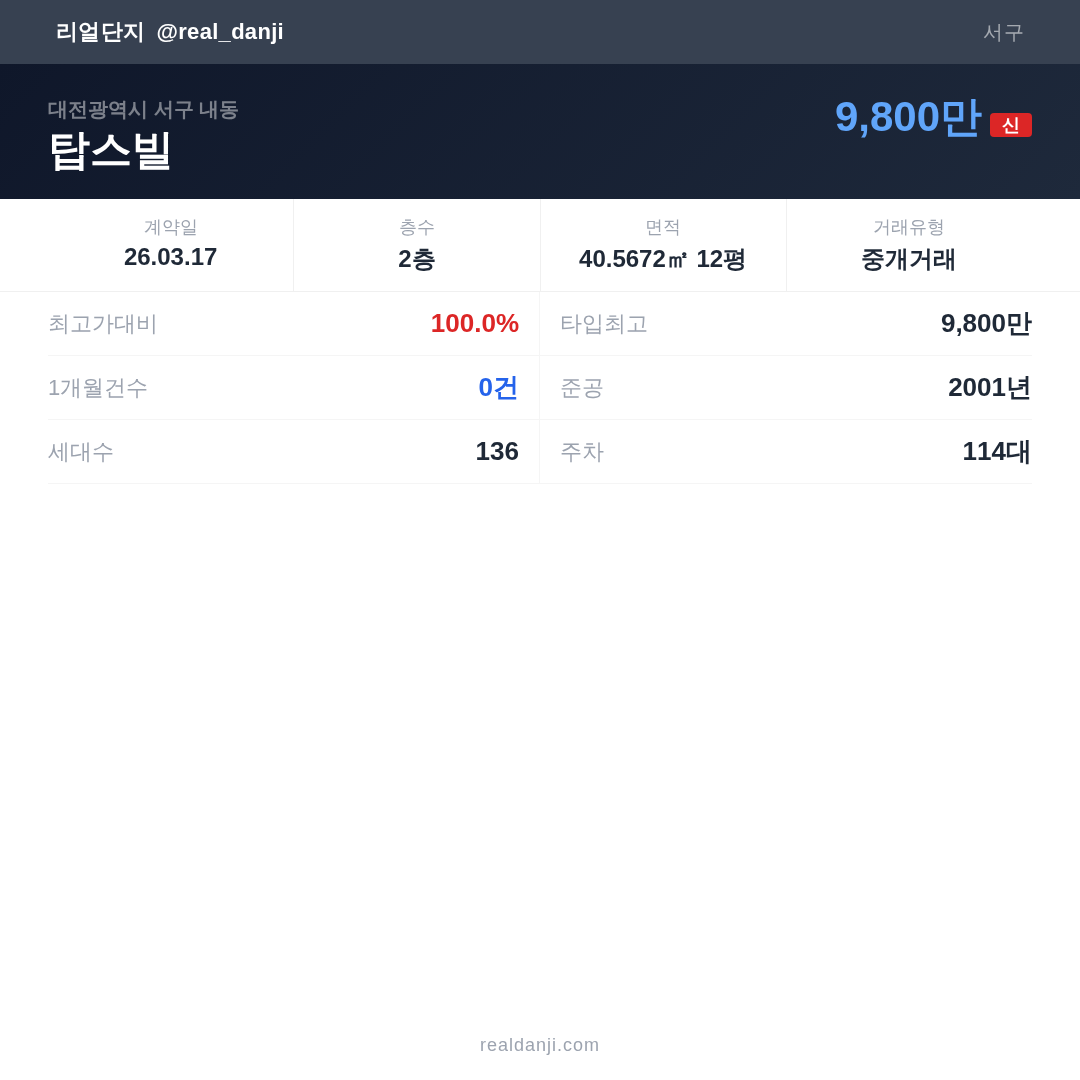 탑스빌 최근 거래가는 9,800만입니다. (2026-03)