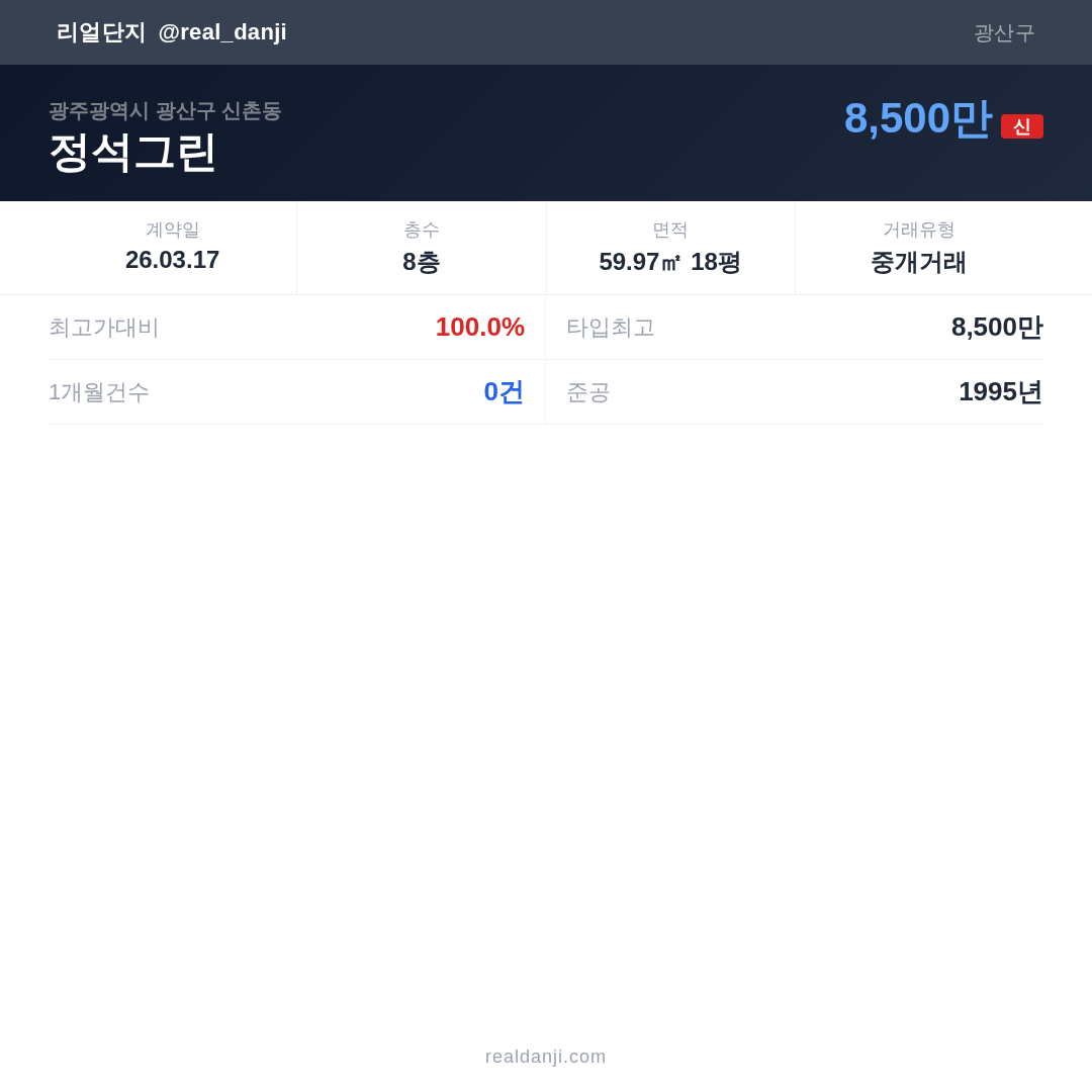 정석그린 최근 거래가는 8,500만입니다. (2026-03)