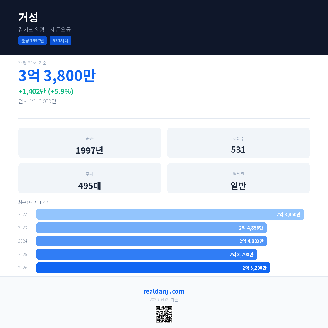 거성 국민평형 기준 2026년 평균 거래가는 2억 5,200만으로, 전년 대비 5.9% 상승 했습니다.