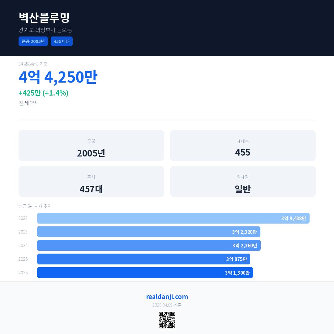 벽산블루밍 최근 거래가는 4억 4,250만입니다. (2026-03)