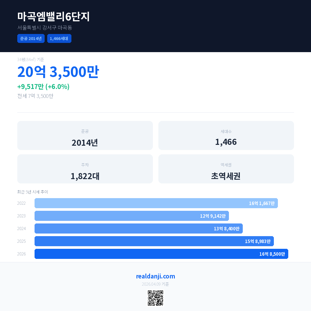 마곡엠밸리6단지 최근 거래가는 20억 3,500만입니다. (2026-03)
