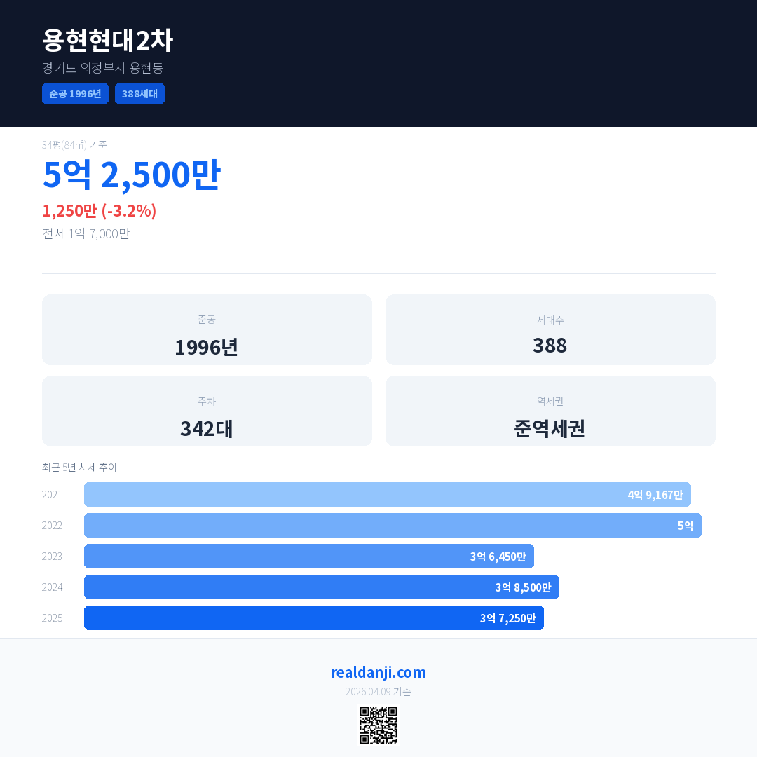 용현현대2차 국민평형 기준 2025년 평균 거래가는 3억 7,250만으로, 전년 대비 3.2% 하락 했습니다.