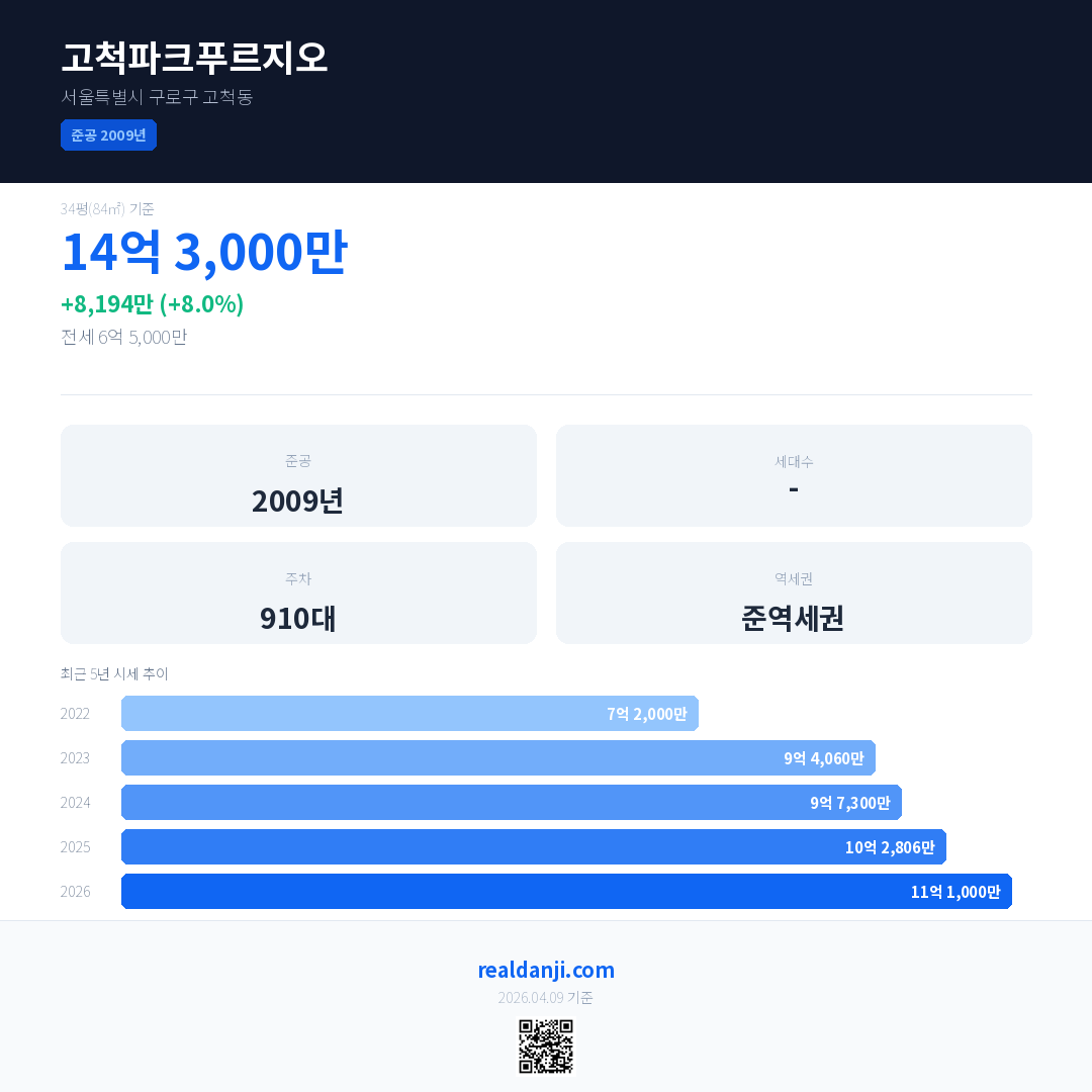 고척파크푸르지오은(는) 2009년에 준공되었으며, 현재 17년차입니다.