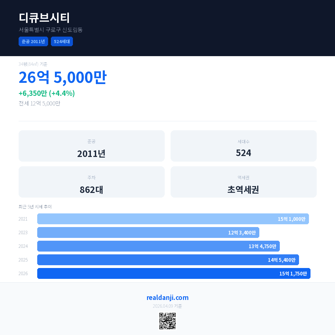 디큐브시티은(는) 2011년에 준공되었으며, 현재 15년차입니다. 총 524세대 규모입니다.
