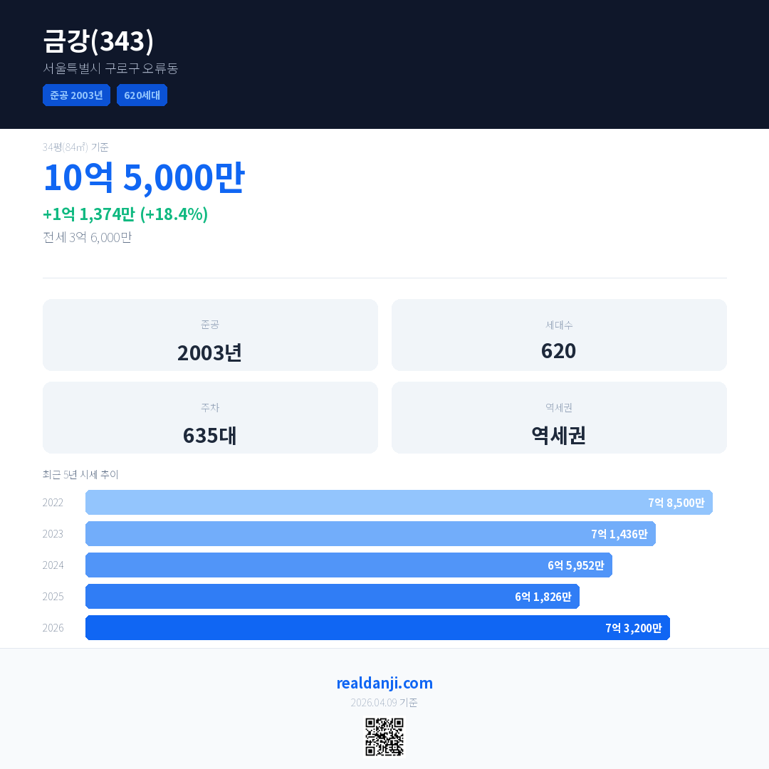 금강(343)은(는) 2003년에 준공되었으며, 현재 23년차입니다. 총 620세대 규모입니다.