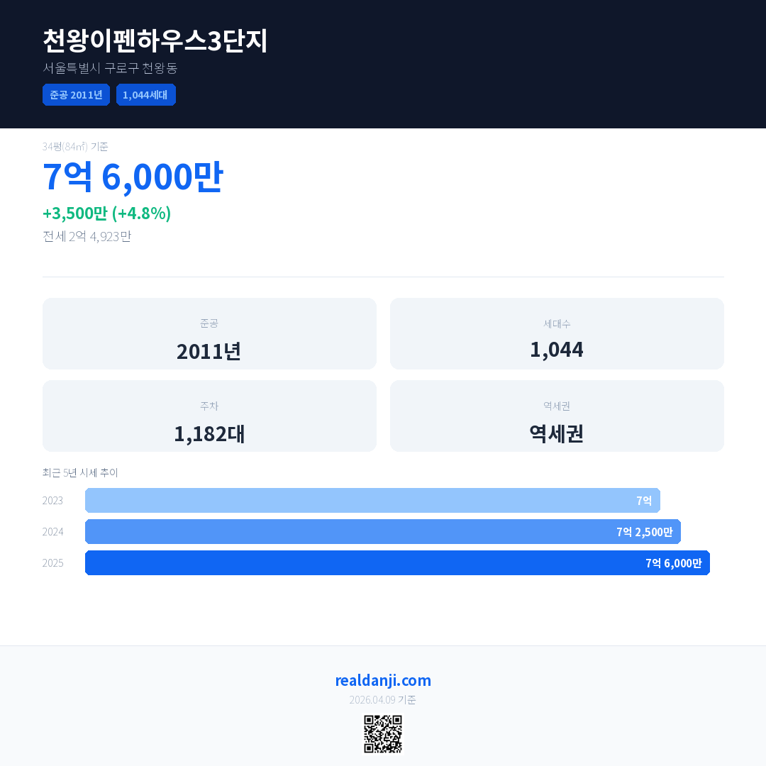 천왕이펜하우스3단지 국민평형 기준 2025년 평균 거래가는 7억 6,000만으로, 전년 대비 4.8% 상승 했습니다.