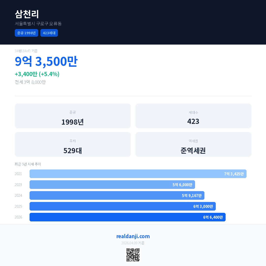 삼천리 국민평형 기준 2026년 평균 거래가는 6억 6,400만으로, 전년 대비 5.4% 상승 했습니다.