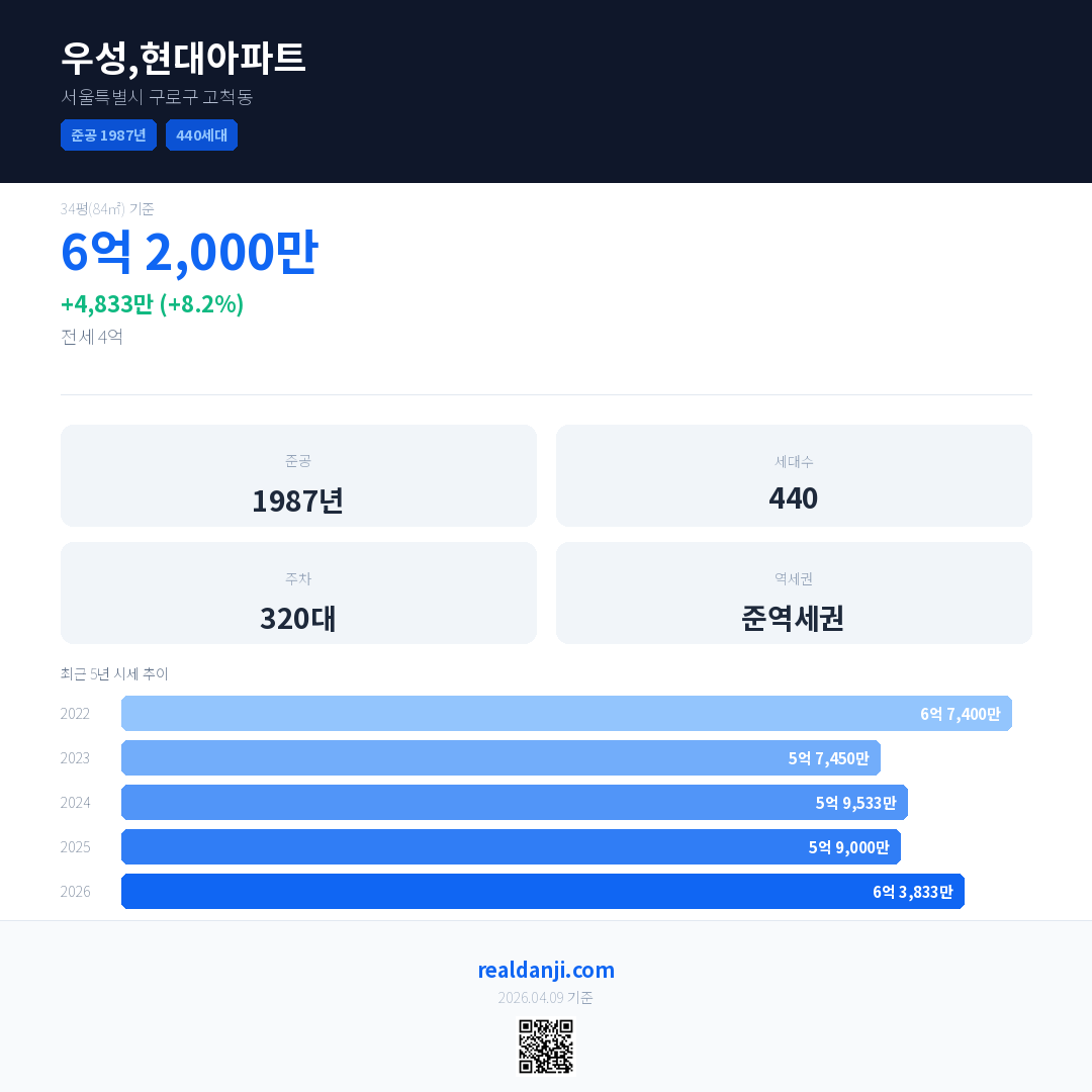 우성,현대아파트 국민평형 기준 2026년 평균 거래가는 6억 3,833만으로, 전년 대비 8.2% 상승 했습니다.