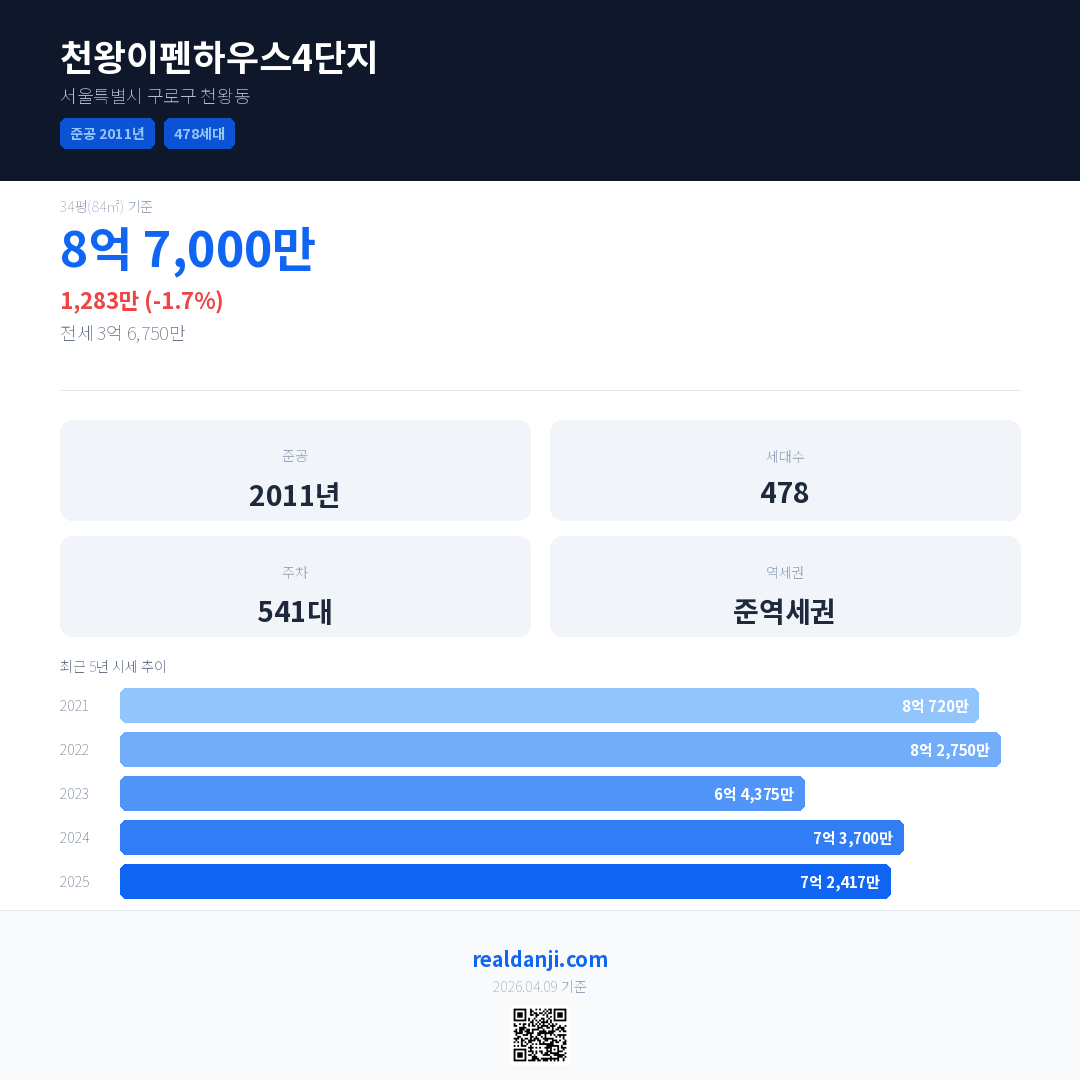 천왕이펜하우스4단지 국민평형 기준 2025년 평균 거래가는 7억 2,417만으로, 전년 대비 1.7% 하락 했습니다.