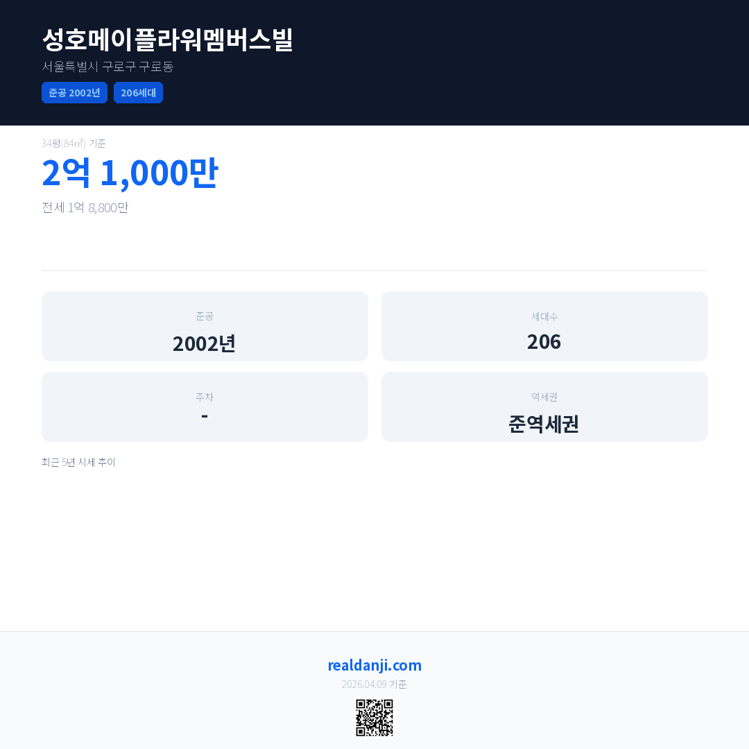 성호메이플라워멤버스빌은(는) 2002년에 준공되었으며, 현재 24년차입니다. 총 206세대 규모입니다.