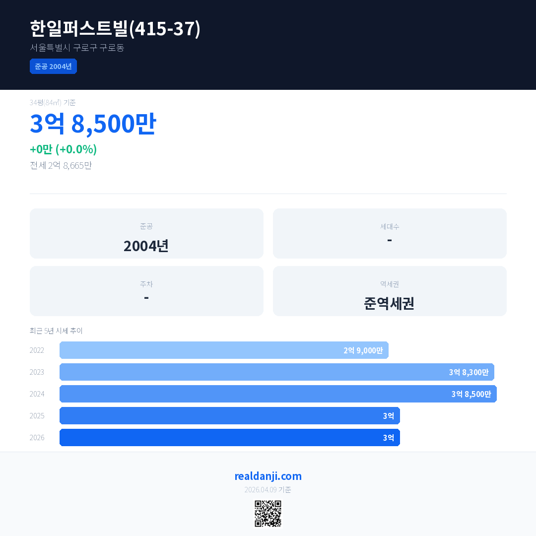 한일퍼스트빌(415-37) 최근 거래가는 3억입니다. (2026-04)